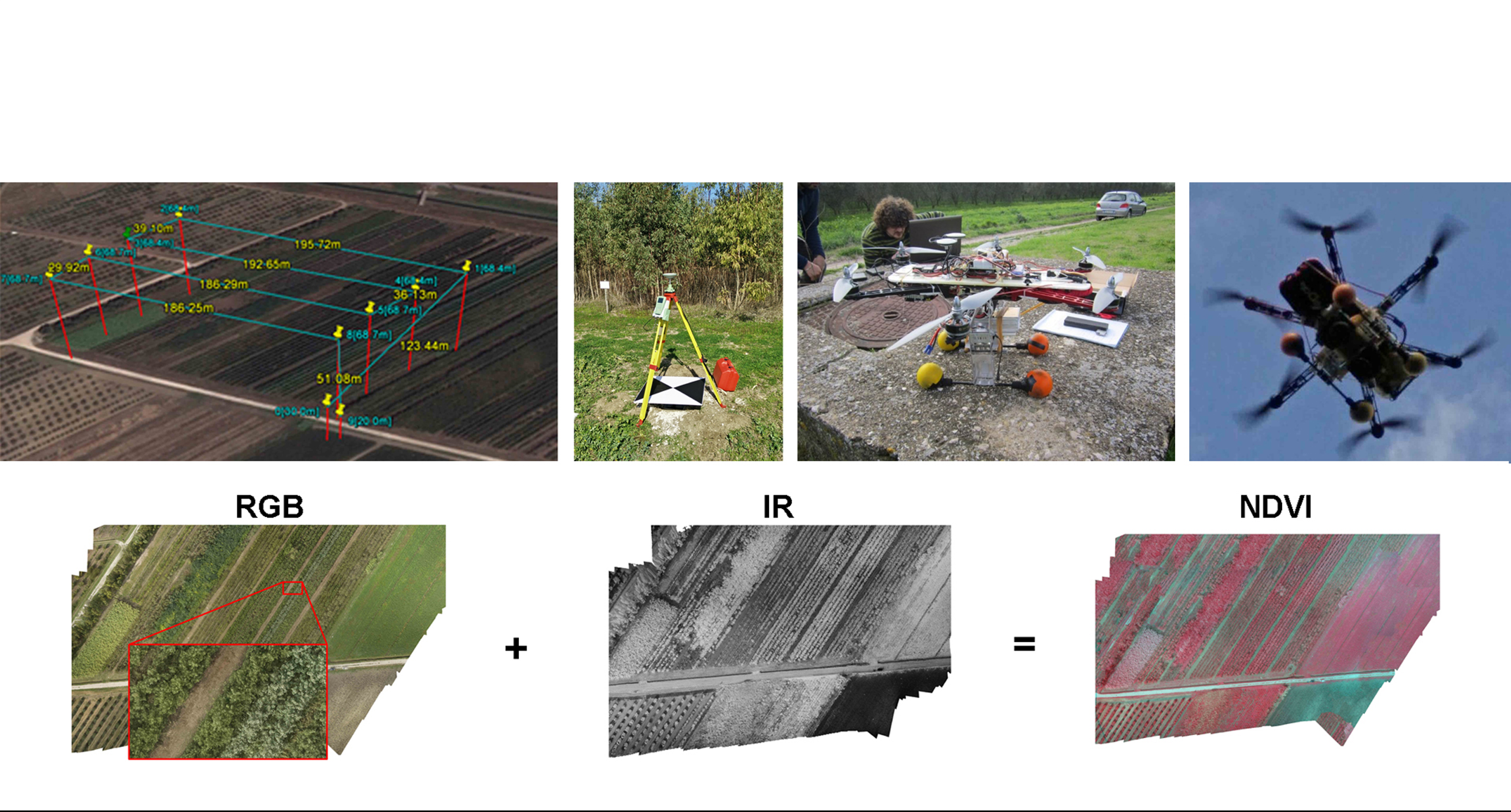 Nell’ambito del progetto, il 3DSurvey Group si è occupato della progettazione di un sistema UAV (3DSL_MR6001 certificato ENAC per OPERAZIONI SPECIALIZZATE NON CRITICHE Rif. ENAC 5011 21/07/2015) in grado di acquisire immagini RGB e IR per poter elaborare immagini in falso colore NDVI che restituiscono informazioni sullo stato di salute della vegetazione. Il campo di test, in località Eboli, è stato disseminato di 16 tie-points (punti fissi) oltre a 5 GCP (ground control points) misurati con strumentazione GPS in modalità statica. I rilievi si sono succeduti con cadenza mensile nell’arco completo di un anno solare.